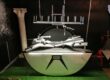 Attrezzi neri con legni invecchiati, corde alle pareti, soffitto scuro e a scomparsa, entrata da finto portone antico pieno di borchie, pavimento in tavolato grezzo…..