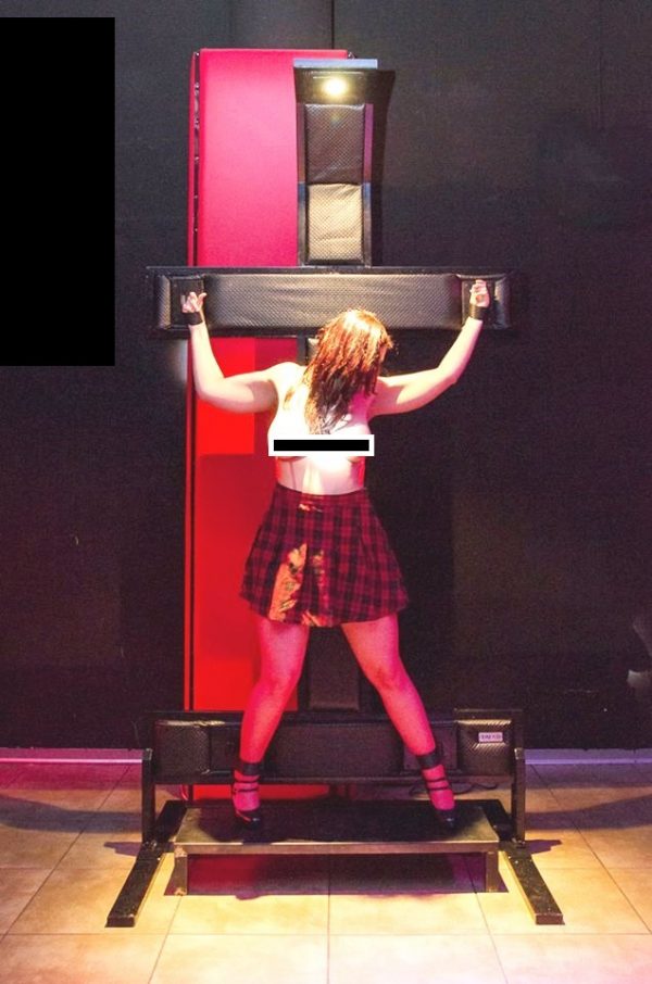 Funzionalità: E’ uno degli attrezzi piu’ classici per chi ama il gioco Sadomaso, visto qui in un contesto estremamente tecnico e pratico. La croce è autoportante e smontabile in 3 minuti, tramite il distacco della parte in verticale, dalla base orizzontale, e lo sgancio della parte superiore provvista di faretto. Le modalità di bloccaggio polsi e caviglie sono con cinghia. E’ indubbiamente un attrezzo dal grande impatto visivo, molto robusto.