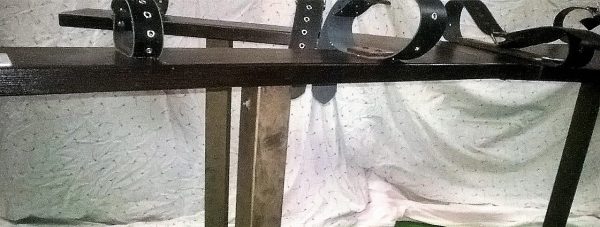 Materiale: Il pianale a croce è completamente in legno massiccio/multistrati,con bordo ingrossato con legno massiccio e presenta cinque posizioni di fissaggio mediante cinghie forate. Nella parte piana, presenta una parte imbottita ,sagomata e rivestita di Similpelle Mod. “Z06h” ( materiale Impermeabile, igienico e inattaccabile da elementi quali cera di candele o similare ).La struttura portante e in ferro,smontabile perche’ il pianale si puo’ dividere a meta,svitando dei pomoli sotto,e le quattro gambe si possono sganciare,sempre svitando dei pomoli. Tempo di smontaggio circa 4 minujti.