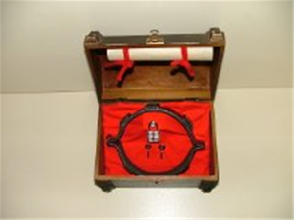Specifiche: E’ un porta collare in legno , a forma di forziere, chiuso con un lucchetto. All’interno un piano rivestito in panno rosso dove è inserito il collare con il suo lucchetto di chiusura, le due chiavi e una Carta/Pergamena arrotolata.