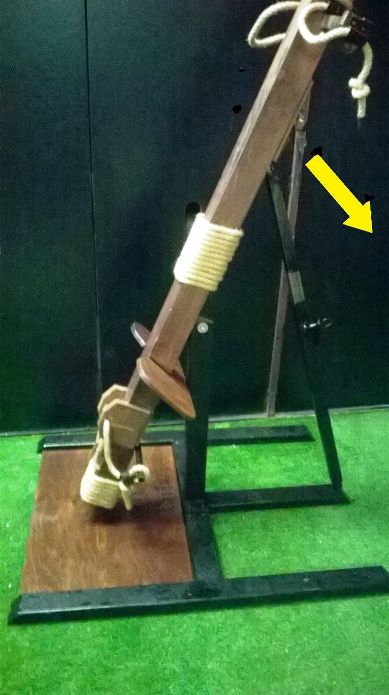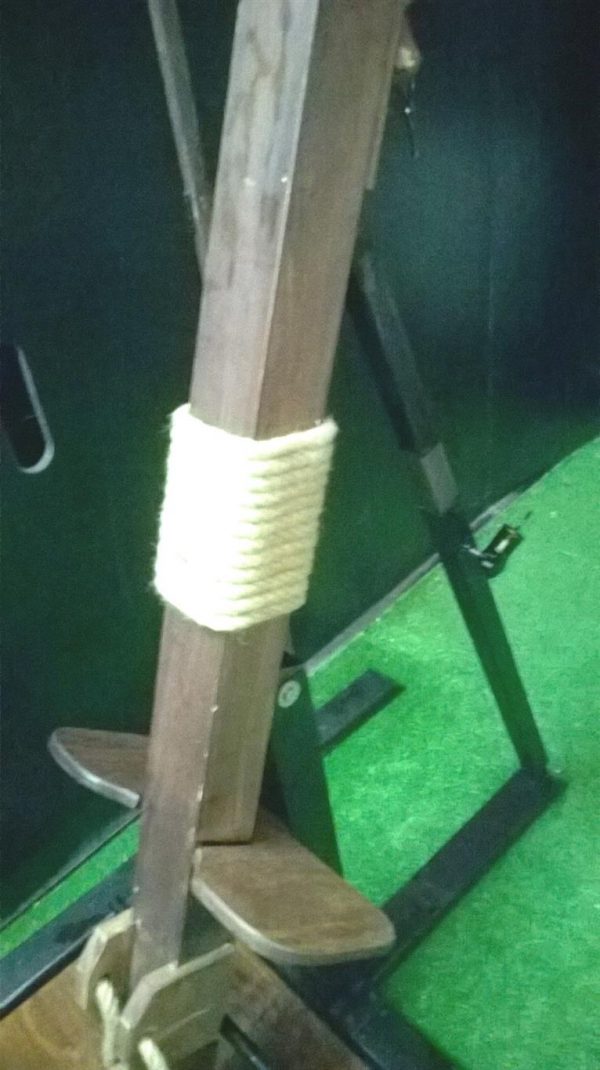 Funzionalità: E’ un attrezzo che era usato per frustare nella schiena i colpevoli di reati,ricostruito dopo ricerca storica e rivisitato per renderlo piu’ affine ad un uso ludico e con piu’ applicazioni di gioco. Presenta la possibilita’ di bloccare polsi e caviglie tramite corda a leva, ed ha un sedile posto in angolazione che permette di avere i genitali liberi e scoperti durante la legatura sull’attrezzo .Il fatto che sia possibile modularlo da posizione verticale a quasi orizzontale, ne permette un uso molto vario ,dal semplice Wipping o Canning, al Firsting o altri giochi di umiliazione.