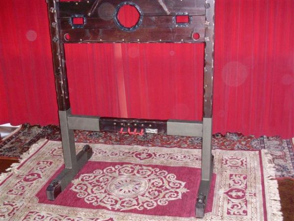 Specifiche: Ha una struttura portante in legno massiccio e ferro,con montanti forati per permettere lo spostamento in altezza dei componenti centrali della gogna. Il fermo è dato da speciali “chiodi in legno” di nostra produzione. Questo modello presenta una serie di borchie in bronzo,come supporto estetico frontale.