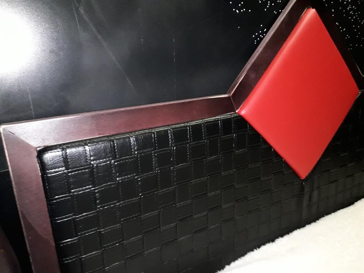 Specifiche: Ha una struttura portante in ferro, rivestita nelle sponde laterali del letto con legno, mentre la pediera e la testiera, hanno delle parti imbottite e rivestite in Ecopelle. Le basi delle colonne di legno agli angoli, sono provviste di anelli di fissaggio