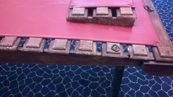 Specifiche: piano in legno a curvatura fisiologica, su struttura in tubolare di ferro. il piano presenta dei punti di fissaggio per polsiere e cavigliere un pannello imbottito e rivestito in similpelle “Z06h” ( materiale Impermeabile, igienico e inattaccabile da elementi quali cera di candele o similare) .