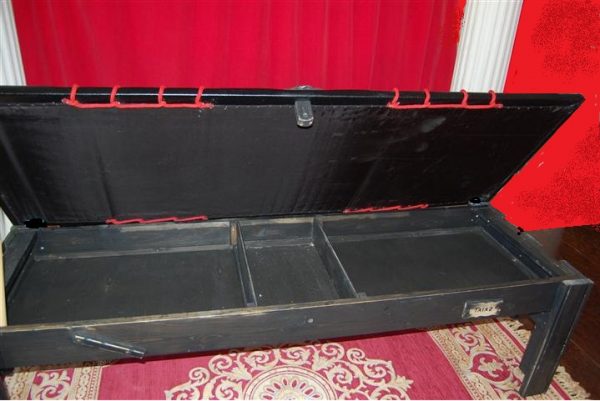 Finiture: Le parti in legno sono state esteticamente colorate ed invecchiate con patina anticante “N.S.D.” e verniciate con finitura atossica all’acqua. Le parti in ferro (le piastre con gli anelli da aggancio) sono state trattate con antichizzante e verniciate con vernici specifiche. Il piano superiore è stato imbottito e rivestito con similpelle “Z06h” ( materiale Impermeabile, igienico e inattaccabile da elementi quali cera di candele o similare ).La parte interna del piano è rivestita in tessuto impermeabile e lavabile, di colore nero.