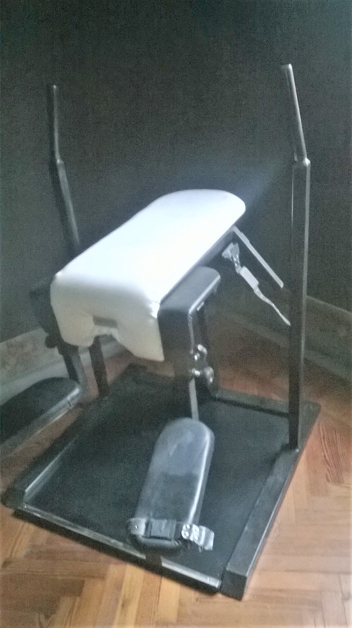 Specifiche: Panca imbottita su struttura in ferro, dale varie regolazioni. Puo’ essere modificata l’altezza dell’attrezzo, l’angolazione del piano superiore, la distanza tra piano superiore e il piano di appoggio delle ginocchia, e puo’ essere modificata anche la misura delle cinghie di costrizioni dei polsi ,rispetto il piano di appoggio. Tutte le suddette regolazioni avvengono attraverso l’avvitamento di appositi pomelli in plastica, su bullone metallici.