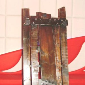 Materiale: E’ un prodotto con struttura in tubolare di ferro e parti in legno massiccio. Ci sono piccoli inserti imbottiti e rivestiti con similpelle “Z06h” ( materiale Impermeabile, igienico e inattaccabile da elementi quali cera di candele o similare ),poste su una struttura sagomata in ferro.
