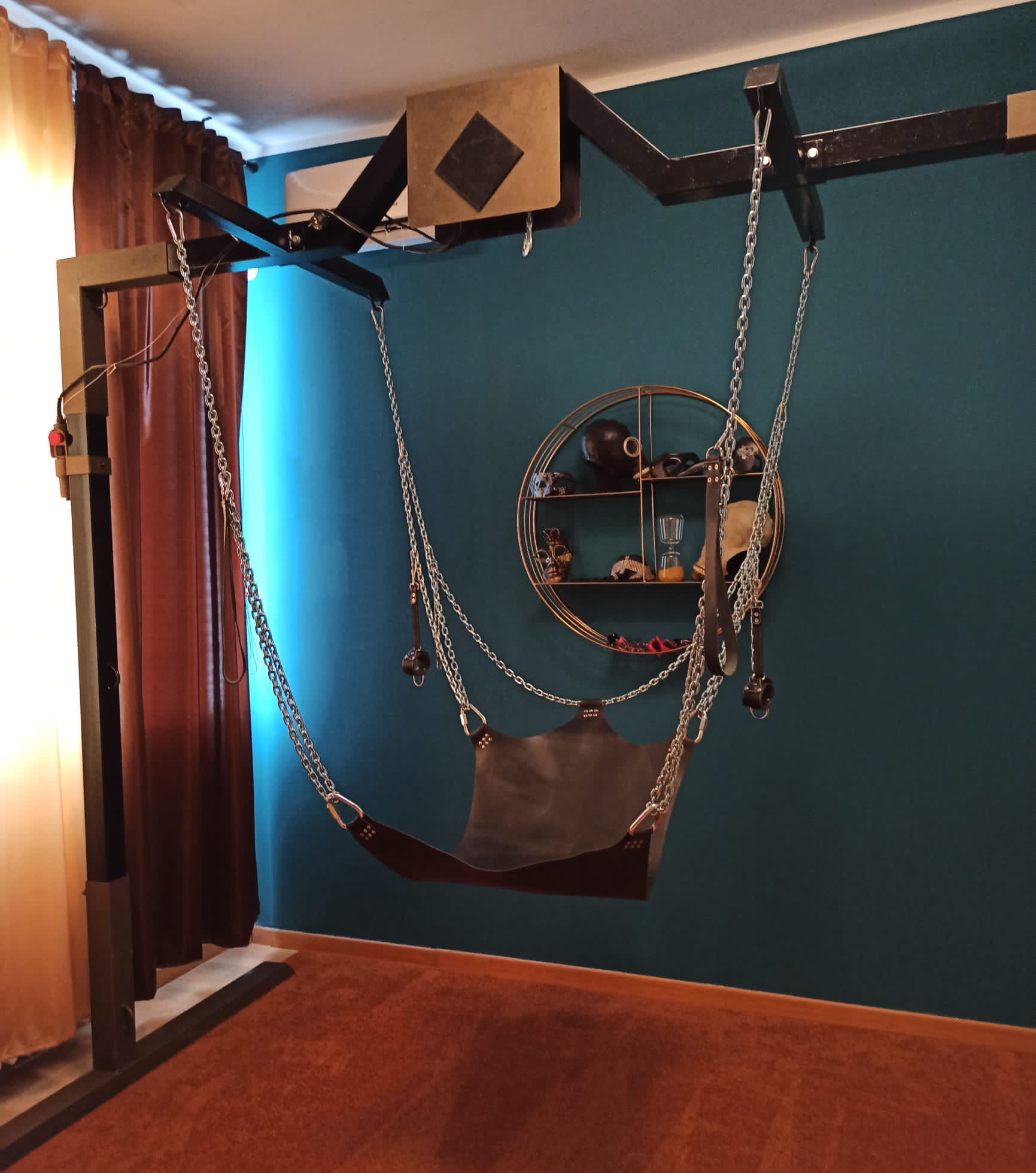 Funzionalita’: Questo articolo, si propone come robusta alternativa ai supporti normalmente venduti negli attrezzi di gioco “appesi”, altalene,sling, piani sospesi in cuoio… che raramente risultano stabili nell’uso intensivo dell’ attrezzo. Permette poi di usarli senza alcun fori né nel muro, né nel soffitto, scaricando il peso, grazie alla struttura portante, direttamente a terra. Questo attrezzo specifico ha poi l’optional dell’elevatore elettrico centrale ,a 220 volts, potenzialita’ di carico oltre 200 kg, che ne permette svariate applicazioni di gioco.