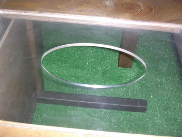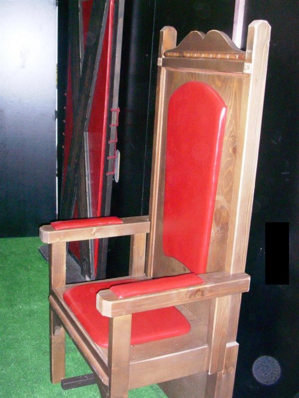 Specifiche: Trono strutturato in legno massiccio su una struttura autoportante in ferro. Questa struttura permette lo sganciare delle gambe anteriori del trono e lo scoprire di un pianale in plexiglass predisposto per giochi di pissing.